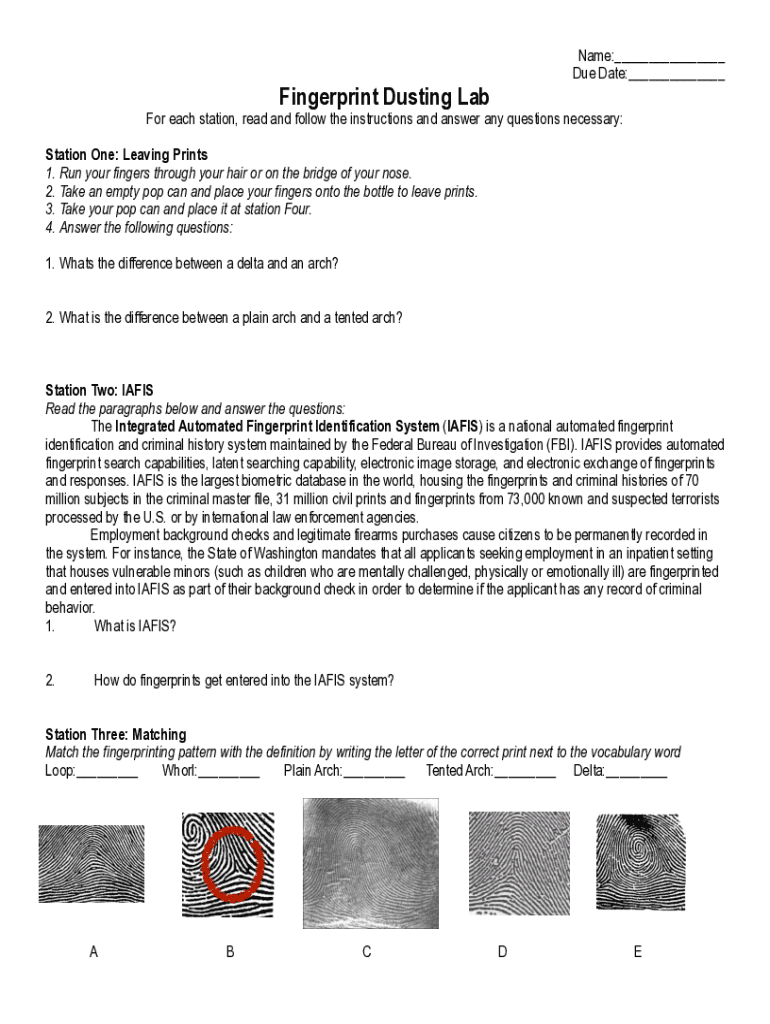 Name:___ Due Date:___Fingerprint Dusting Labor each station, read and follow the instructions and answer any questions necessary: Station One: Leaving Prints 1. Run your fingers through your hair