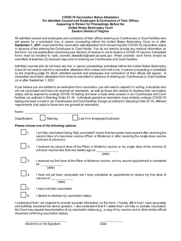 COVID-19 Vaccination Status Attestation For Admitted Counsel and Employees & Contractors of Their Offices Appearing in Person for Proceedings Before the United States Bankruptcy Court Eastern District