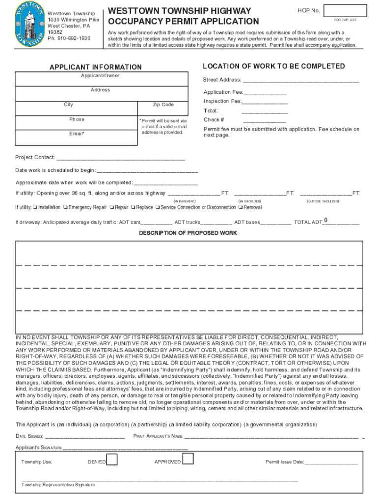 West town Township 1039 Wilmington Pike West Chester, PA 19382 pH: 6106921930WESTTOWN TOWNSHIP HIGHWAY OCCUPANCY PERMIT APPLICATION No. FOR TWP. Sean's work performed within the rightofway of a Township