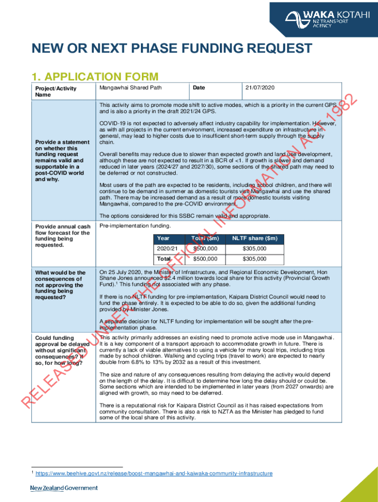 NEW OR NEXT PHASE FUNDING REQUEST 1. APPLICATION FORM Mangawhai Shared PathDate21/07/202082Project/Activity Name19This activity aims to promote mode shift to active modes, which is a priority in the