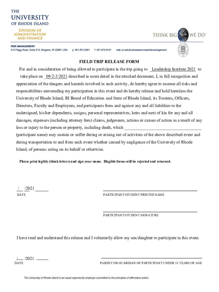 FIELD TRIP RELEASE FORM For and in consideration of being allowed to participate in the trip going to _Leadership Institute 2021 to take place on _09/23/2021 described in more detail in the attached