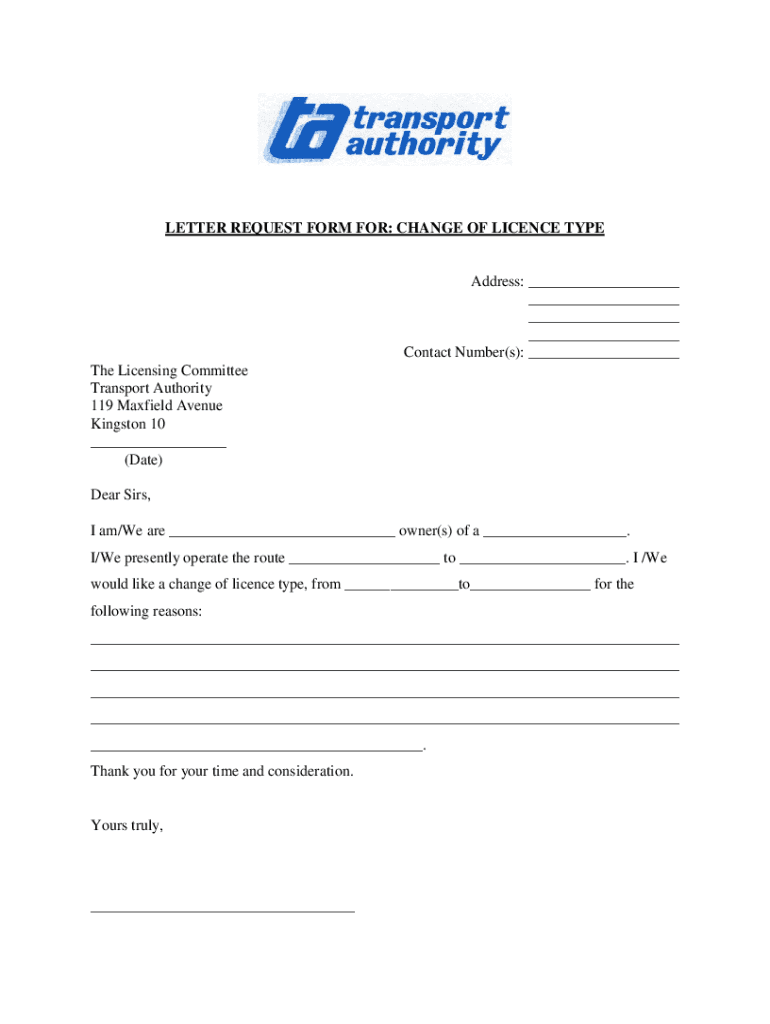 Get the free LETTER REQUEST FORM FOR CHANGE OF LICENCE TYPE.docx