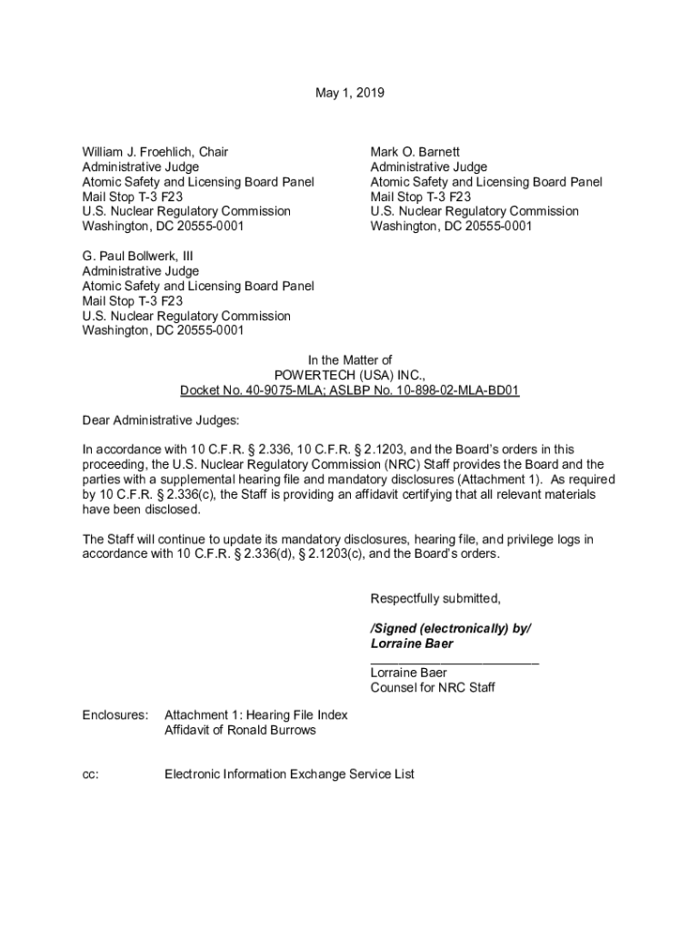 May 1, 2019William J. Frolic, Chair Administrative Judge Atomic Safety and Licensing Board Panel Mail Stop T3 F23 U.S. Nuclear Regulatory Commission Washington, DC 205550001Mark O. Barnett Administrative