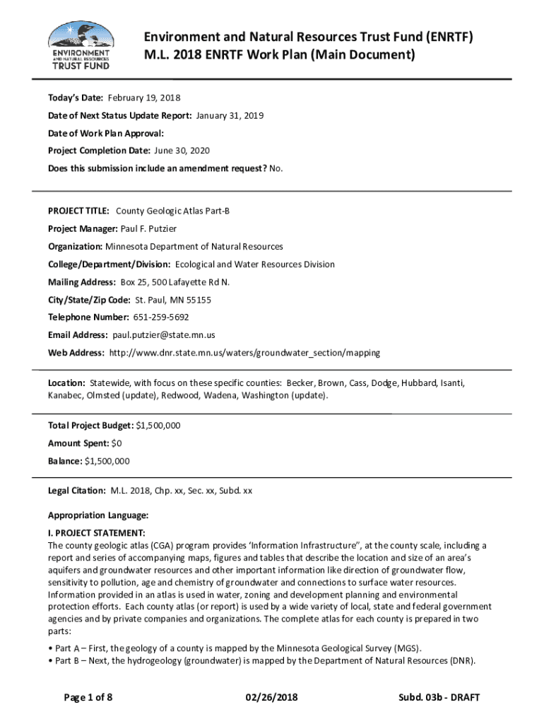 Environment and Natural Resources Trust Fund (EN RTF) M.L. 2018 EN RTF Work Plan (Main Document) Today's Date: February 19, 2018, Date of Next Status Update Report: January 31, 2019, Date of Work