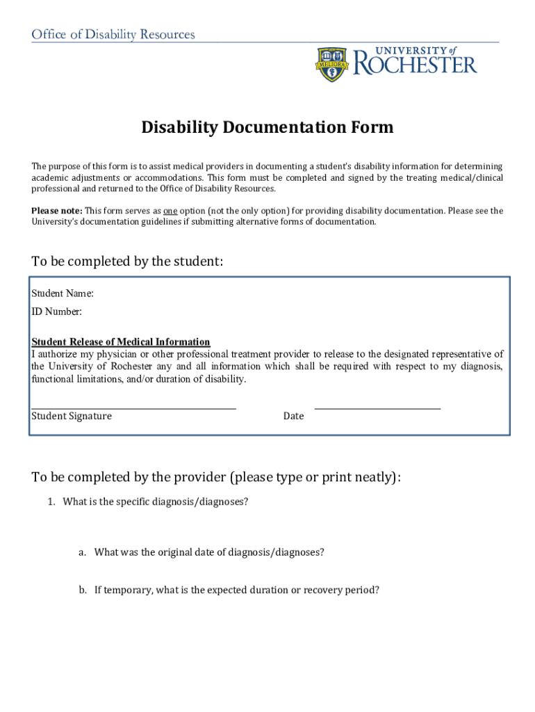 Office of Disability ResourcesDisability Documentation Form The purpose of this form is to assist medical providers in documenting a students' disability information for determining academic adjustments