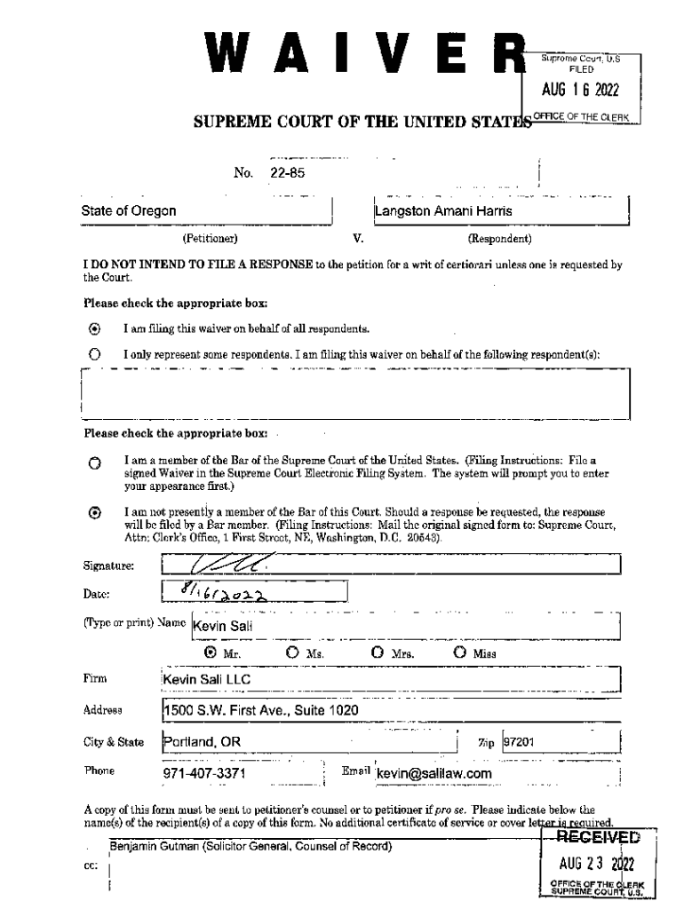 WAIVESupreme Court. U.S. FILED! AUG 1 6 2022SUPREME COURT OF THE UNITED OFFICE OF THE CLERK No. 2285 State of OregonLangston Mani Harris (Petitioner)V.(Respondent)I DO NOT INTEND TO FILE A RESPONSE