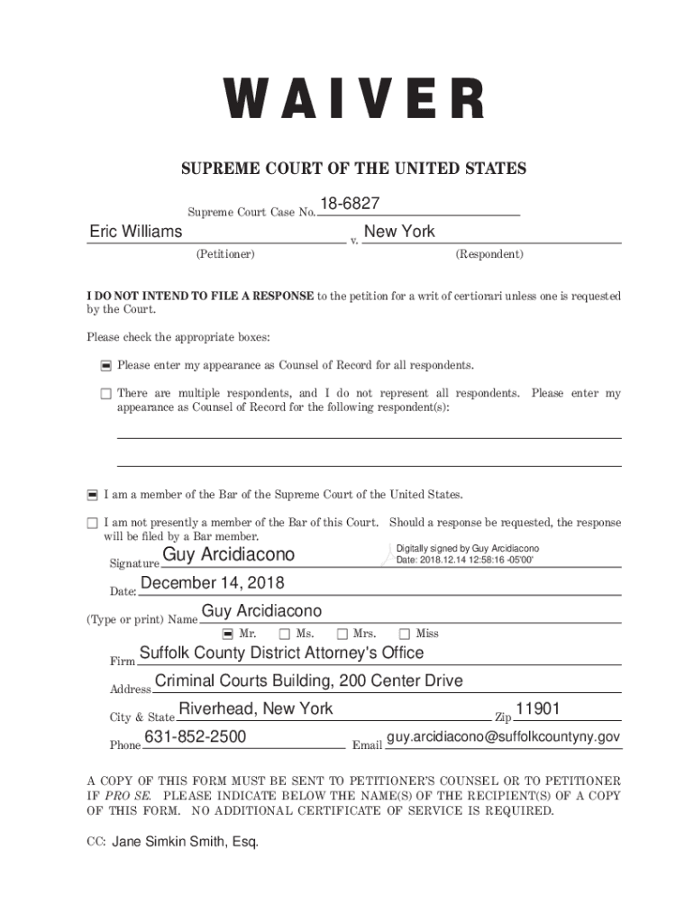 WAIVER SUPREME COURT OF THE United States Supreme Court Case No.186827Eric Williams. New York(Petitioner)(Respondent)I DO NOT INTEND TO FILE A RESPONSE to the petition for a writ of certiorari unless
