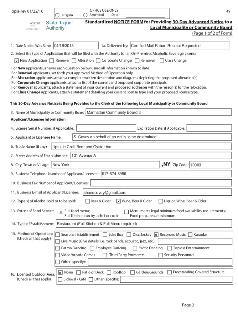 OFFICE USE ONLYoplarev 01/22/16 49DateAmendedOriginalStandardized NOTICE FORM for Providing 30Day Advanced Notice to a Local Municipality or Community Board (Page 1 of 2 of Form) 1. Date Notice Was