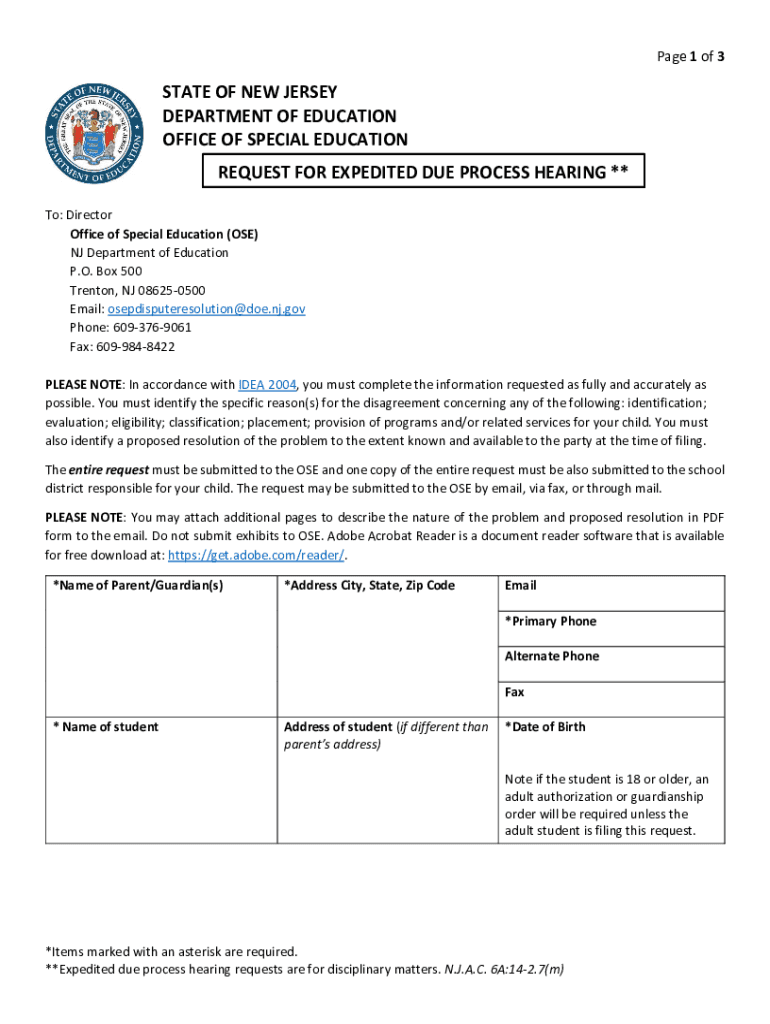 Page 1 of 3STATE OF NEW JERSEY DEPARTMENT OF EDUCATION OFFICE OF SPECIAL EDUCATION REQUEST FOR EXPEDITED DUE PROCESS HEARING ** To: Director Office of Special Education (ONE) NJ Department of Education