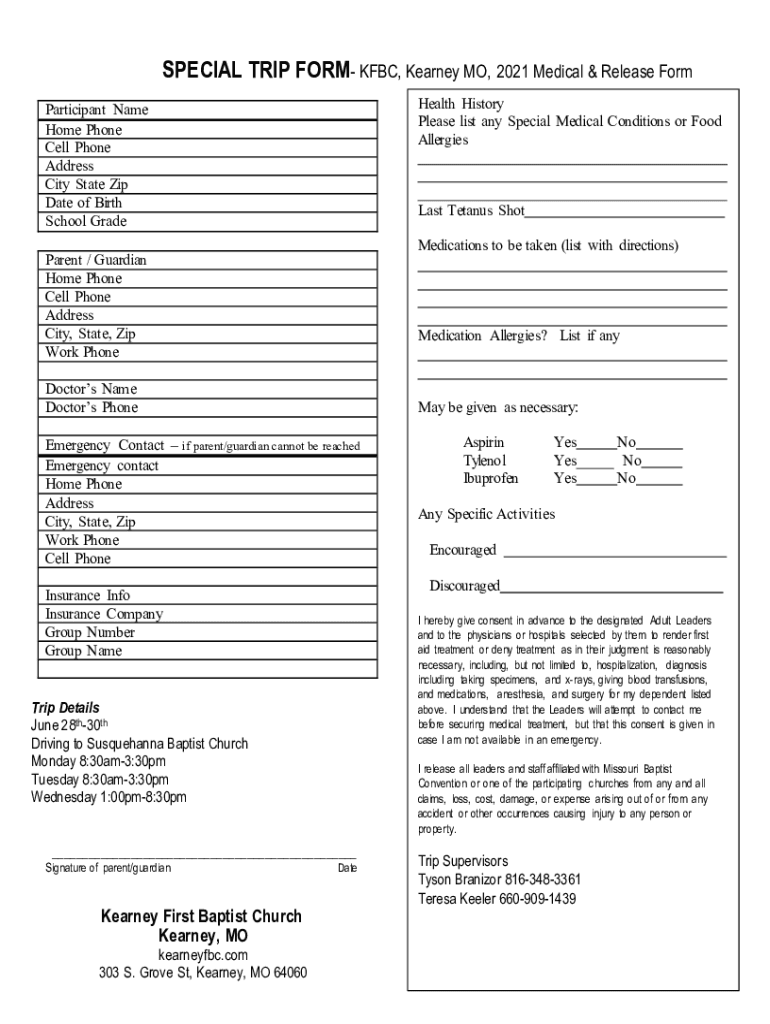 SPECIAL TRIP FORM KFC, Kearney MO, 2021 Medical & Release Form