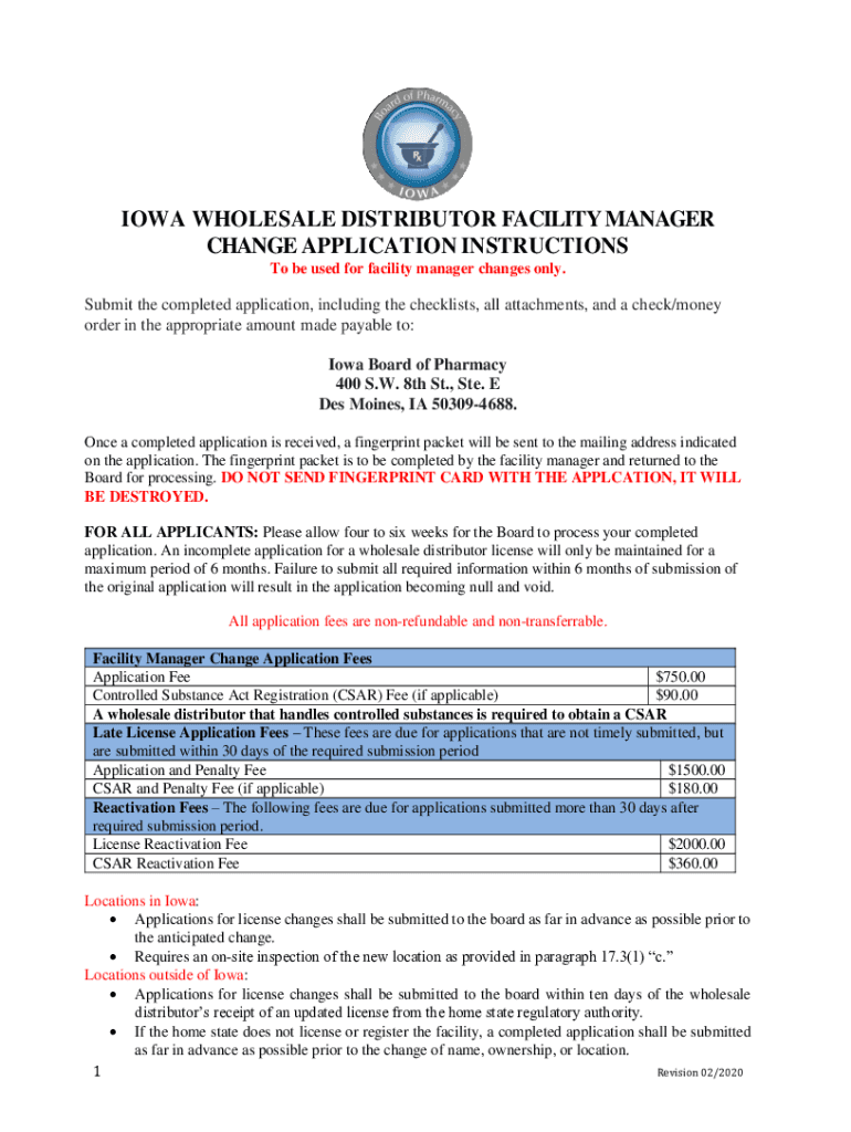 IOWA WHOLESALE DISTRIBUTOR FACILITY MANAGER CHANGE APPLICATION INSTRUCTIONS To be used for facility manager changes only. Submit the completed application, including the checklists, all attachments,