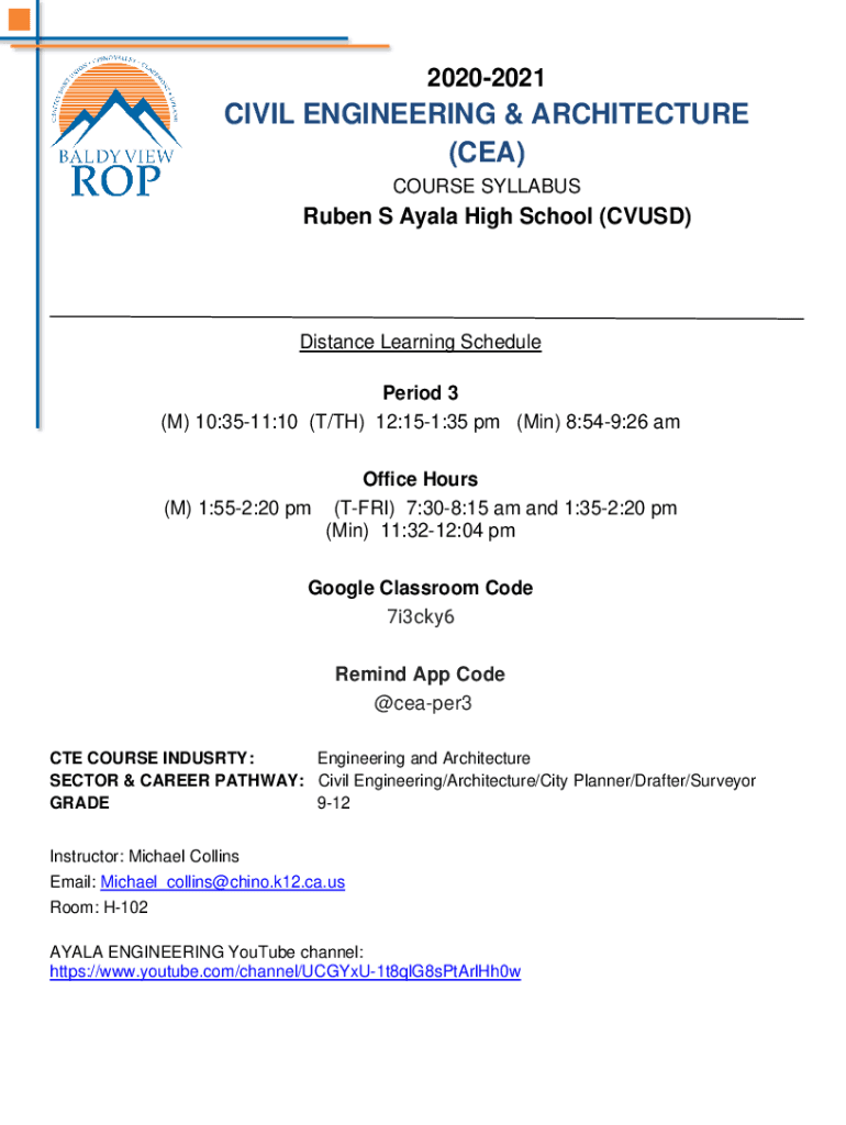 20202021CIVIL ENGINEERING & ARCHITECTURE (CEA) COURSE SYLLABUS Ruben S Ayala High School (CV USD)Distance Learning Schedule Period 3 (M) 10:3511:10 (T/TH) 12:151:35 pm (Min) 8:549:26 am Office Hours