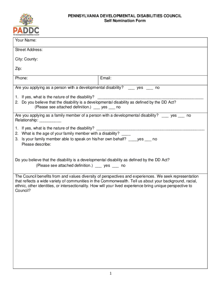 PENNSYLVANIA DEVELOPMENTAL DISABILITIES COUNCIL Self Nomination Former Name: Street Address: City: County: Zip: Phone:Email:Are you applying as a person with a developmental disability?___ yes ___