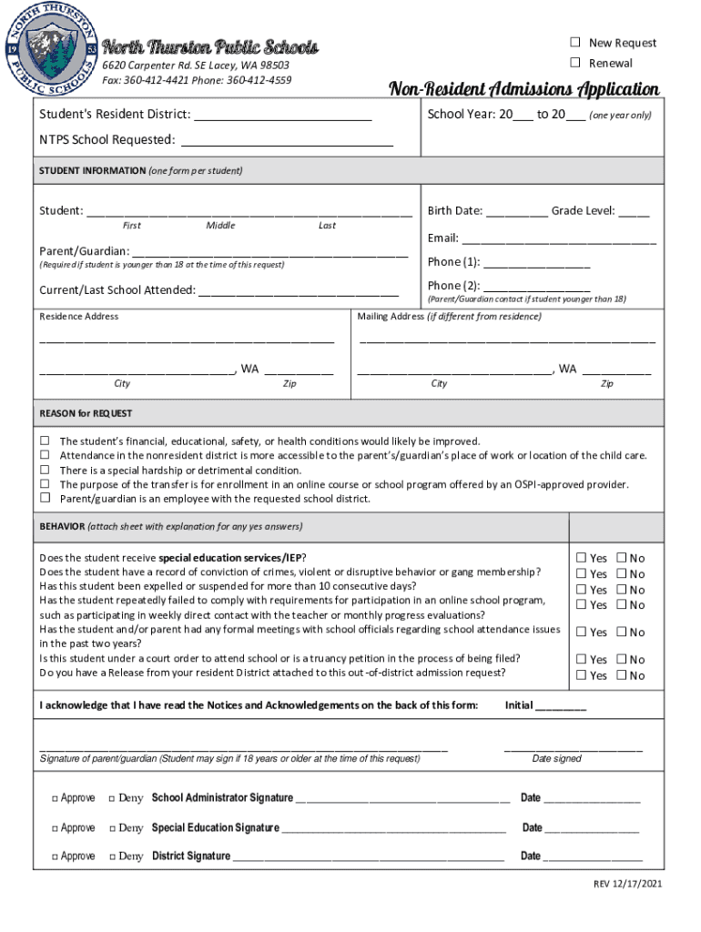 North Thurston Public Schools New Request Renewal6620 Carpenter Rd. SE Lacey, WA 98503 Fax: 3604124421 Phone: 3604124559NonResident Admissions ApplicationStudent\'s Resident District: ___School Year: