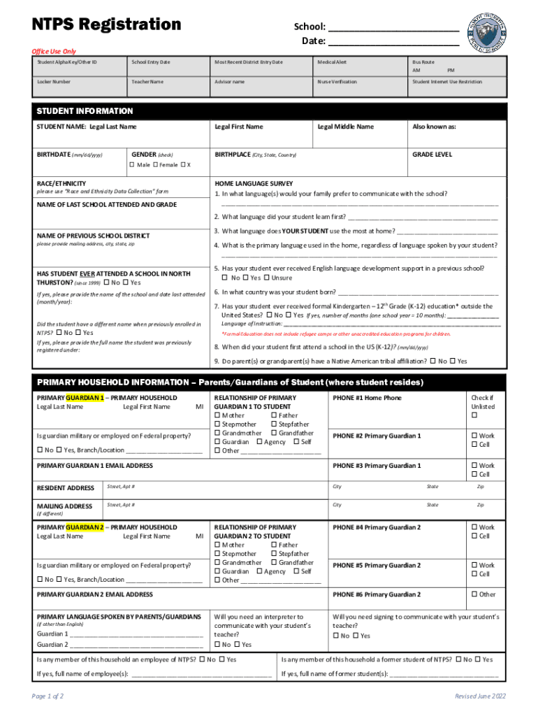 NTPs RegistrationSchool: ___ Date: ___Office Use Only Student Alpha Key/Other School Entry Gatepost Recent District Entry Paramedical Alerts Route AML ocker NumberTeacher NamePMAdvisor reimburse VerificationStudent