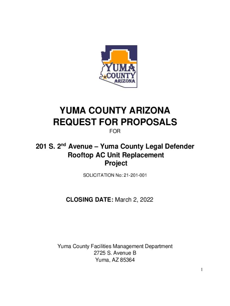 YUMA COUNTY ARIZONA REQUEST FOR PROPOSALS FOR201 S. 2nd Avenue Yuma County Legal Defender Rooftop AC Unit Replacement Project SOLICITATION No: 21201001CLOSING DATE: March 2, 2022Yuma County Facilities
