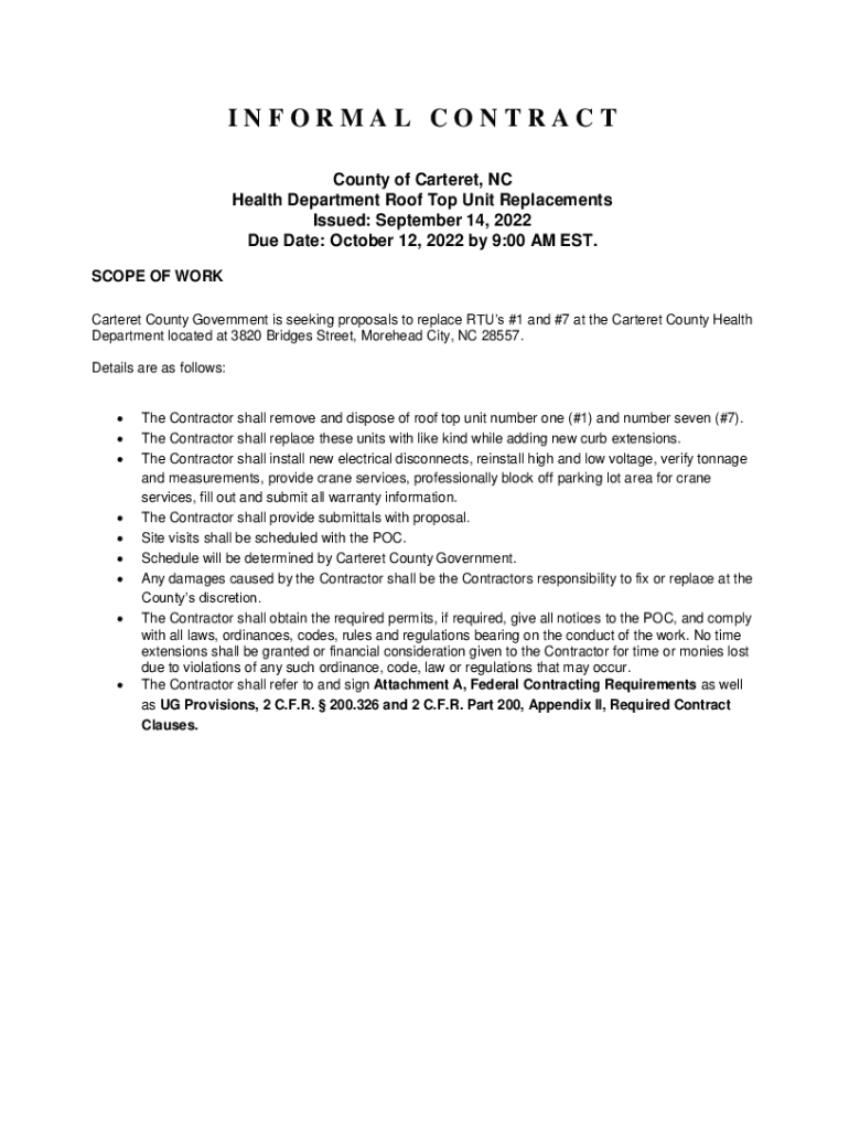 INFORMAL CONTRACT County of Carteret, NC Health Department Roof Top Unit Replacements Issued: September 14, 2022, Due Date: October 12, 2022, by 9:00 AM EST. SCOPE OF WORK Carteret County Government
