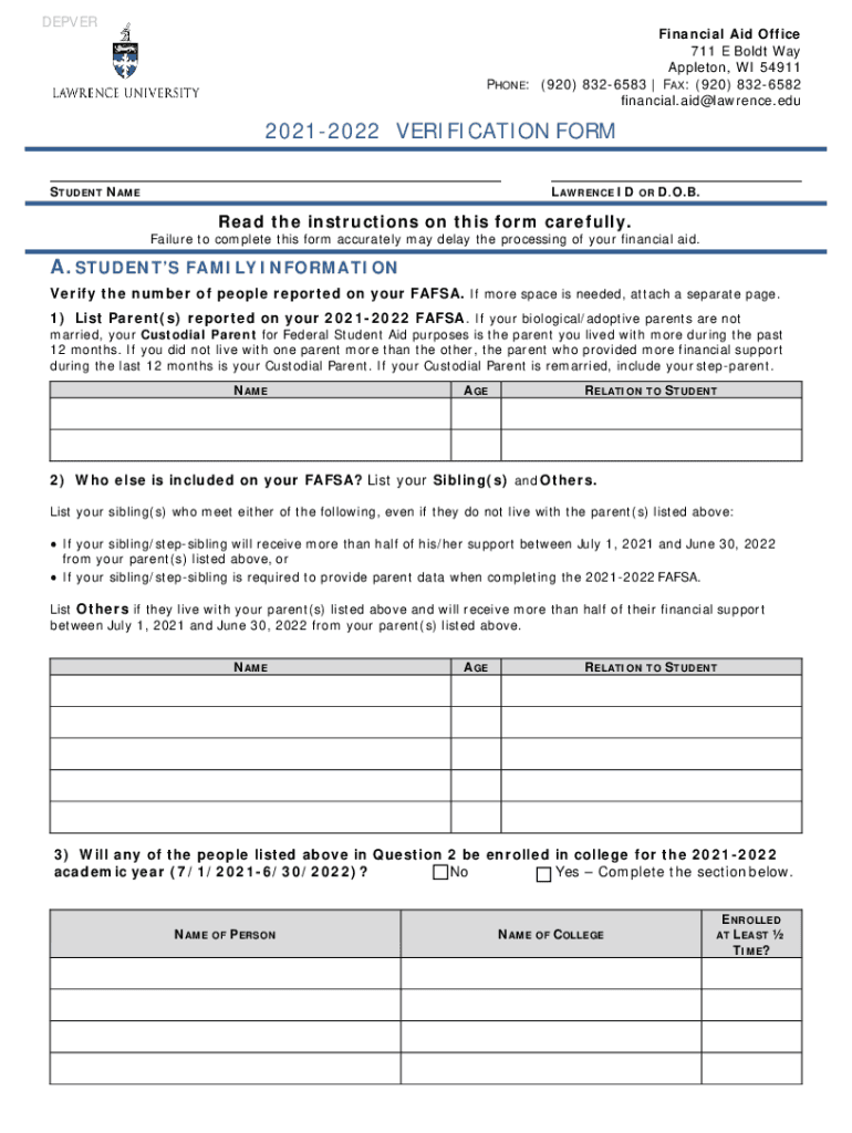 DEPVERFinancial Aid Office 711 E Bold Way Appleton, WI 54911 PHONE: (920) 8326583 | FAX: (920) 8326582 financial.aid@lawrence.edu20212022 VERIFICATION FORM STUDENT NAMELAWRENCE ID ORD. O.B. Read the