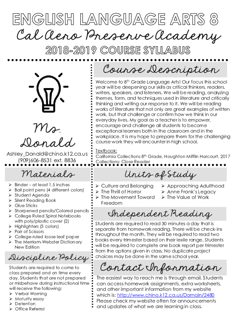 Cal Aero Preserve Academy Course Descriptions. DonaldAshley_Donald@chino.k12.ca.us (909)6068531 ext. 8836Materials Binder at least 1.5 inches Ball point pens (4 different colors) Student Agenda Silent