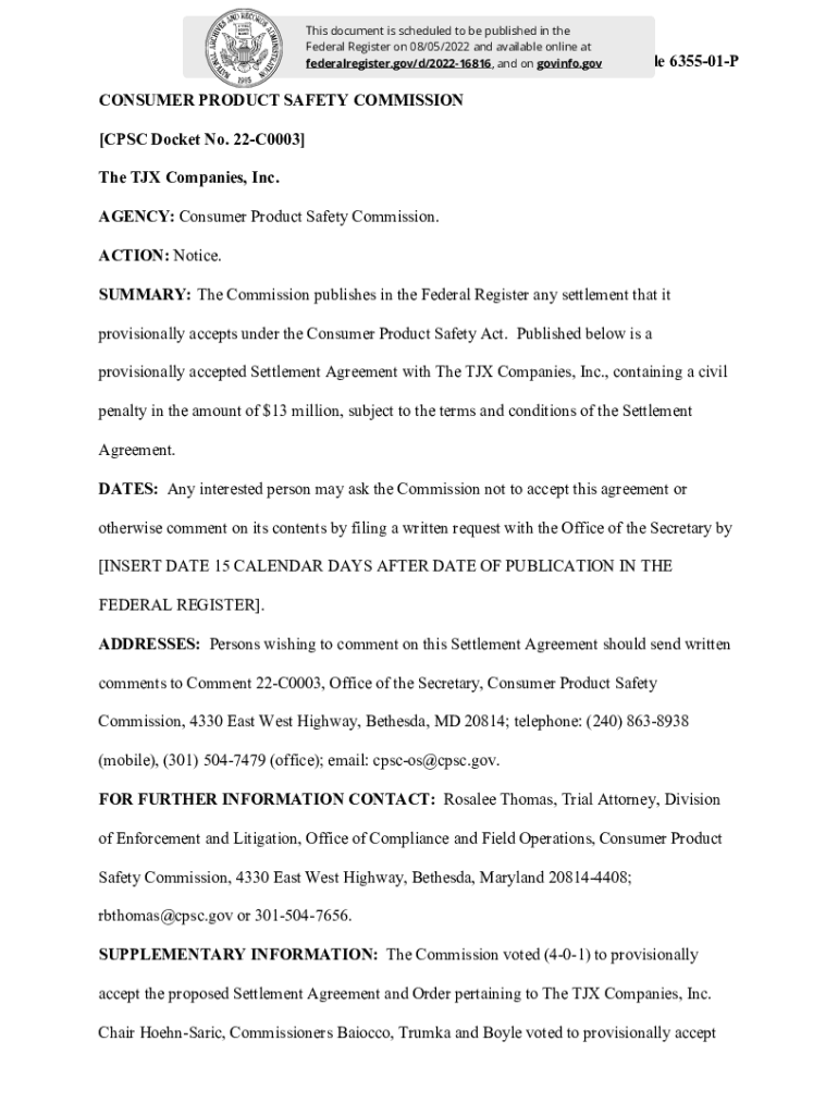 This document is scheduled to be published in the Federal Register on 08/05/2022 and available online at Billing federalregister.gov/d/202216816, and on gov info. Goode 635501PCONSUMER PRODUCT SAFETY