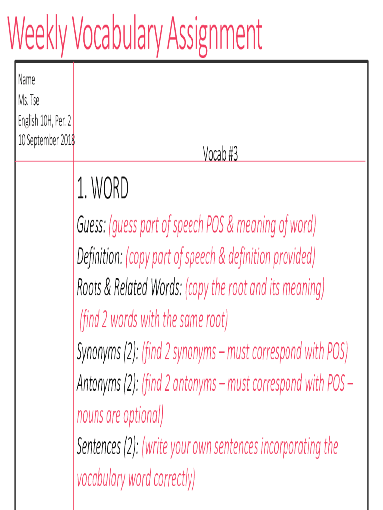 Weekly Vocabulary Assignment Name Ms. TSE English 10H, Per. 2 10 September 2018Vocab #31. WORD Guess: (guess part of speech POS & meaning of word) Definition: (copy part of speech & definition provided)