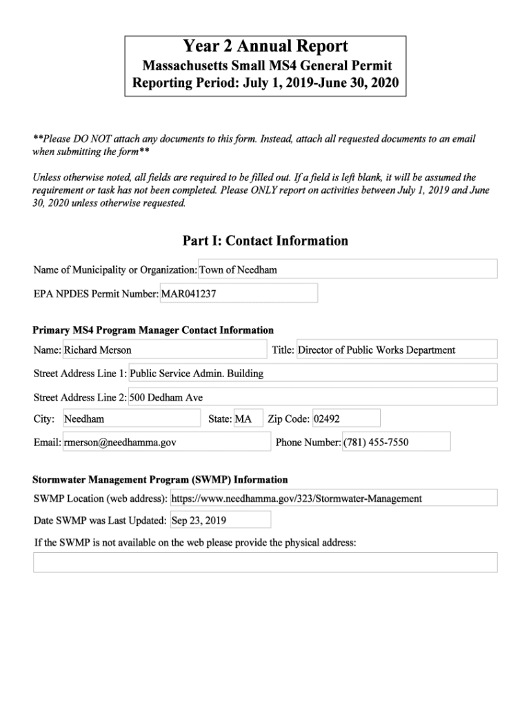 Year 2 Annual Report Massachusetts Small MS4 General Permit Reporting Period: July 1, 2019June 30, 2020**Please DO NOT attach any documents to this form. Instead, attach all requested documents to