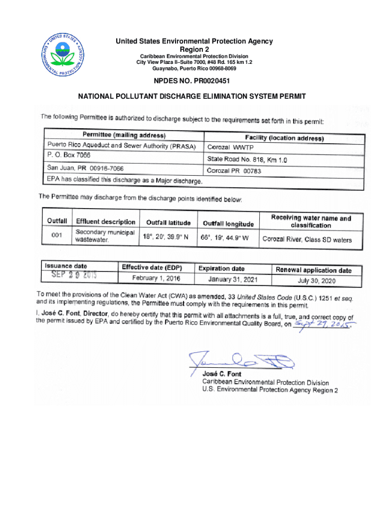 United States Environmental Protection Agency Region 2 Caribbean Environmental Protection Division City View Plaza Suite 7000, #48 Rd. 165 km 1.2 Guaynabo, Puerto Rico 009688069NPDES NO. PR0020451