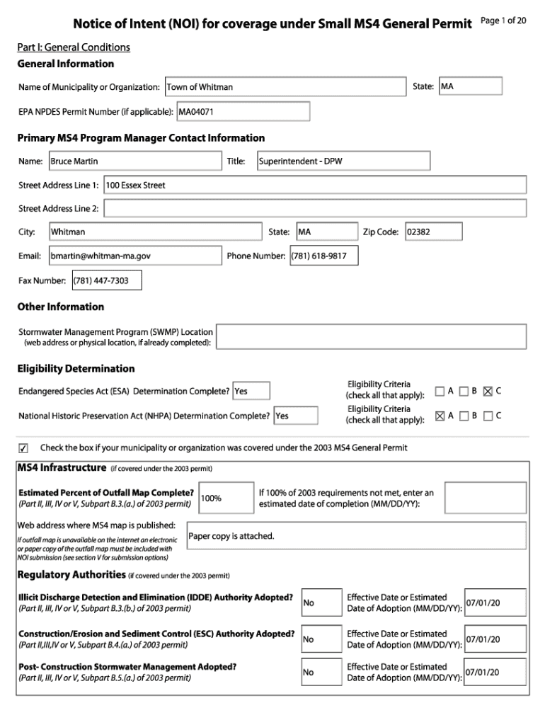 Get the free Notice of Intent (NOI) for coverage under Small MS4 General Permit for Whitman, MA. ...