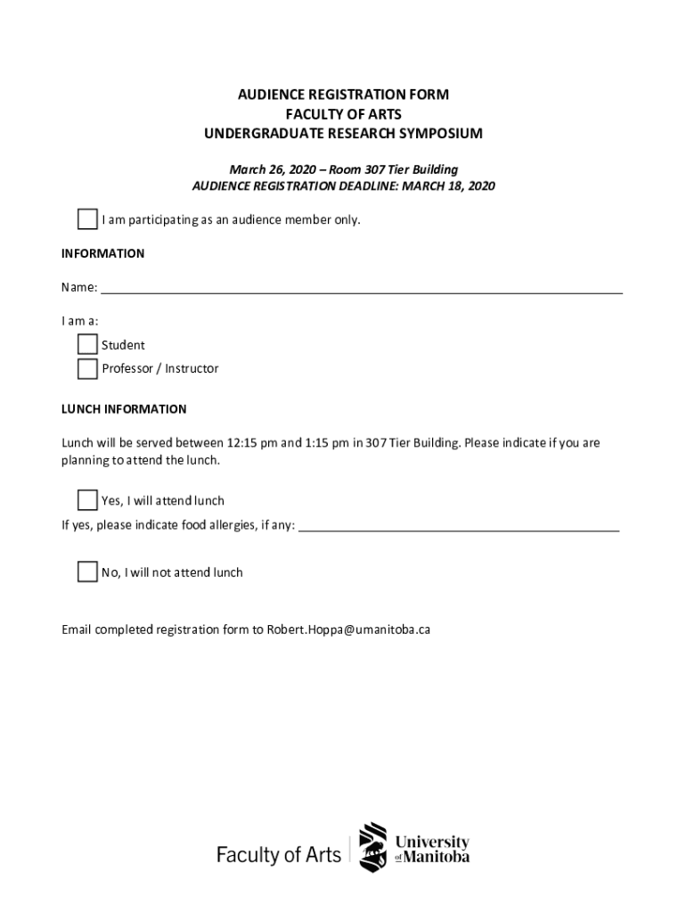 AUDIENCE REGISTRATION FORM FACULTY OF ARTS UNDERGRADUATE RESEARCH SYMPOSIUM March 26, 2020, Room 307 Tier Building AUDIENCE REGISTRATION DEADLINE: MARCH 18, 2020, I am participating as an audience