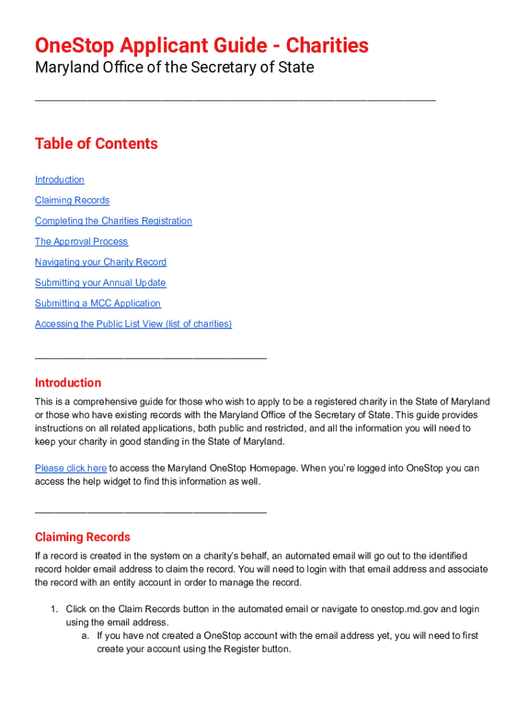One's top Applicant Guide Charities Maryland Office of the Secretary of State ___Table of Contents Introduction Claiming Records Completing the Charities Registration The Approval Process Navigating
