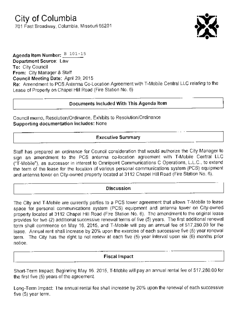B 10115Introduced by ___ First Reading ___Second Reading ___Ordinance No. ___Council Bill No. ___B 10115___AN ORDINANCE authorizing an amendment to the PCS antenna colocation agreement and a memorandum
