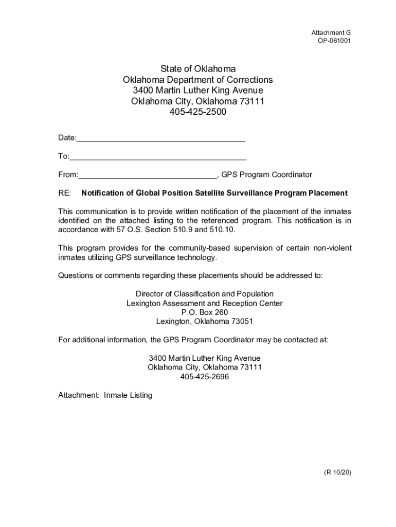 Attachment G OP061001State of Oklahoma Department of Corrections 3400 Martin Luther King Avenue Oklahoma City, Oklahoma 73111 4054252500 Date:___ To:___ From:___, GPS Program Coordinator RE:Notification