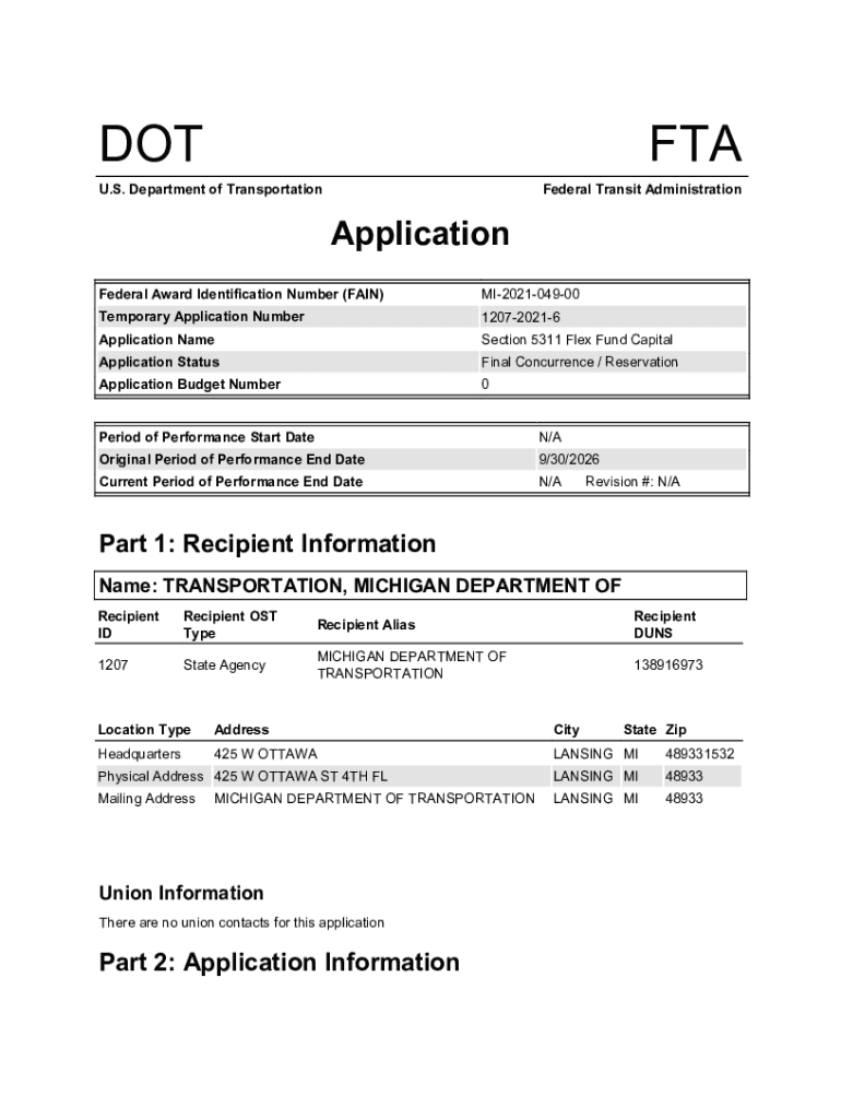 DOTTED. S. Department of Transportation Federal Transit AdministrationApplication Federal Award Identification Number (FAIN)MI202104900Temporary Application Number120720216Application Resection 5311