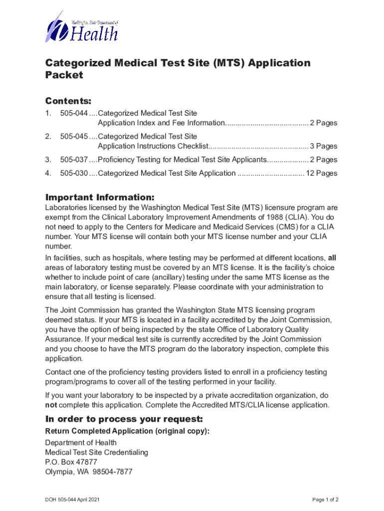 Categorized Medical Test Site (MTS) Application Packet Contents: 1. 505044..... Categorized Medical Test Misapplication Index and Fee Information......................................... 2 Pages 2.