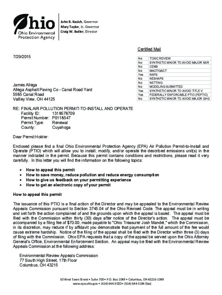 John R. Kasich, Governor Mary Taylor, Lt. Governor Craig W. Butler, DirectorCertified Mail 7/29/2015James Allege Asphalt Paving Co Canal Road Yard 5585 Canal Road Valley View, OH 44125No No No No