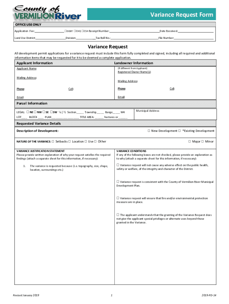 Variance Request Form Application Fee: Land Use District:DEBIT CHQ CSH Receipt Number:Division:Date Received:__Tax Roll No.:File Number:Variance Request All development permit applications for a variance