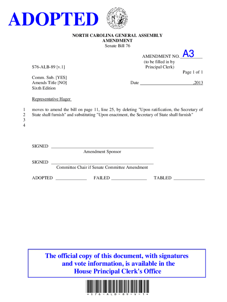 ADOPTED NORTH CAROLINA GENERAL ASSEMBLY AMENDMENT Senate Bill 76A3AMENDMENT NO. ___ (to be filled in by Principal Clerk) Page 1 of 1S76ALB89 [v.1] Comm. Sub. [YES] Amends Title [NO] Sixth EditionDate,2013Representative