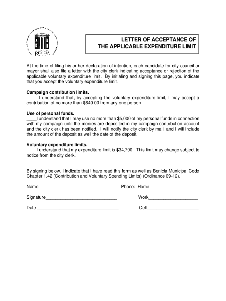 LETTER OF ACCEPTANCE OF THE APPLICABLE EXPENDITURE LIMIT At the time of filing his or her declaration of intention, each candidate for city council or mayor shall also file a letter with the city
