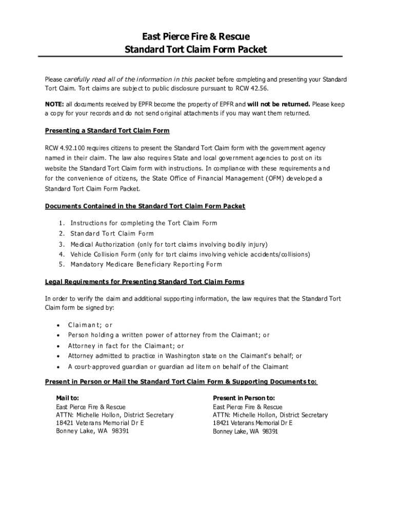 East Pierce Fire & Rescue Standard Tort Claim Form Packet Please carefully read all the information in this packet before completing and presenting your Standard Tort Claim. Tort claims are subject