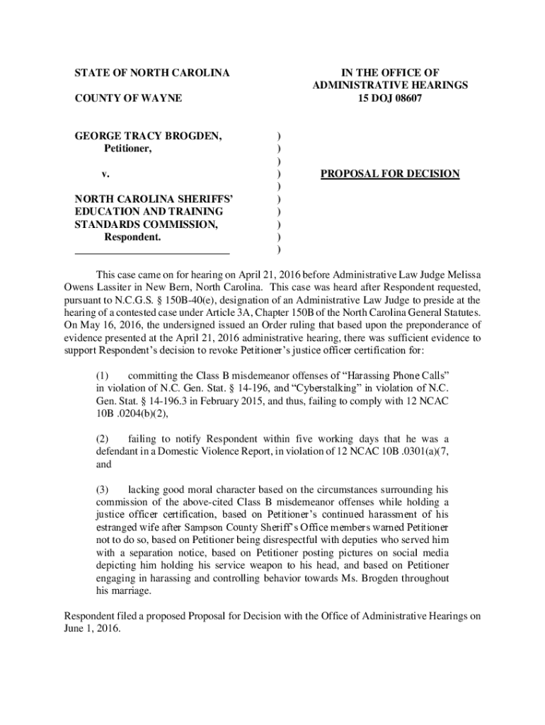 STATE OF NORTH CAROLINA THE OFFICE OF ADMINISTRATIVE HEARINGS 15 DOJ 08607COUNTY OF WAYNEGEORGE TRACY BROADEN, Petitioner, v. NORTH CAROLINA SHERIFFS EDUCATION AND TRAINING STANDARDS COMMISSION, Respondent.