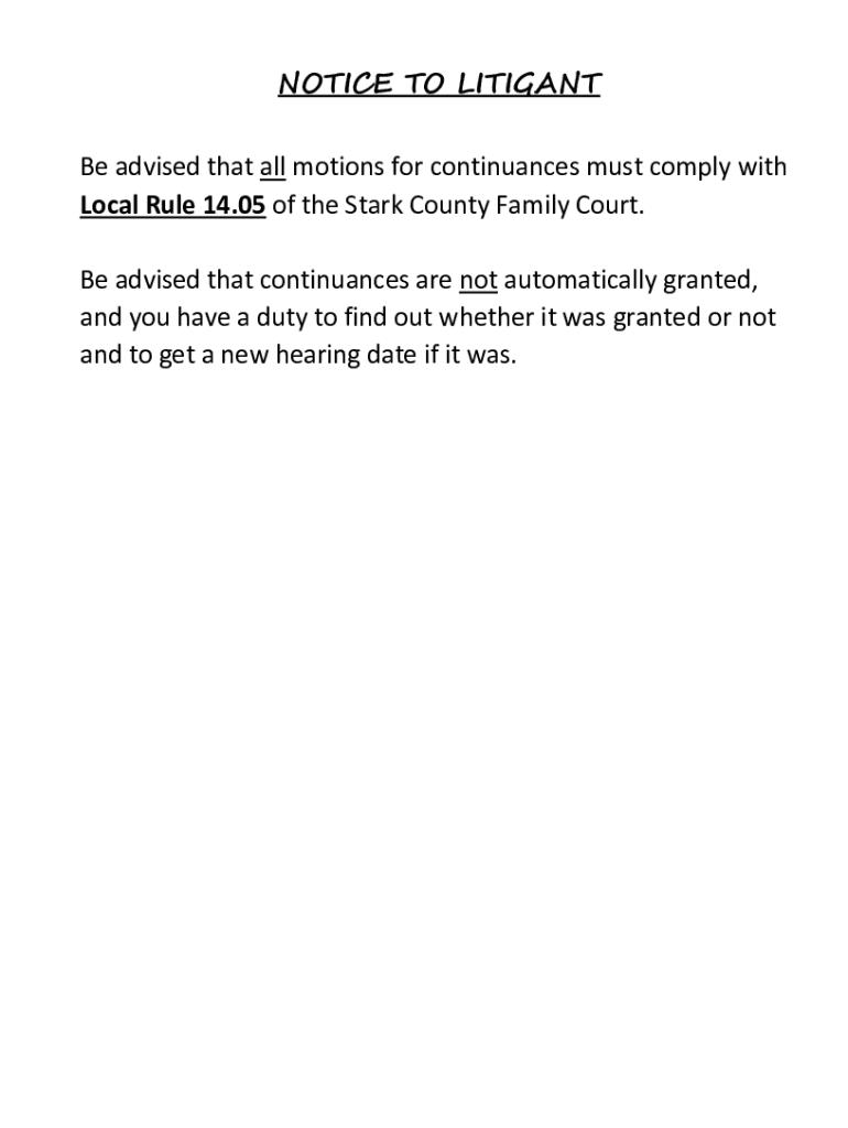 NOTICE TO LITIGANT Be advised that all motions for continuances must comply with Local Rule 14.05 of the Stark County Family Court. Be advised that continuances are not automatically granted, and