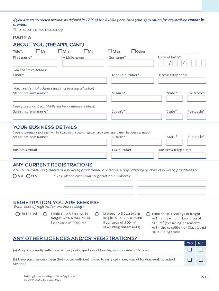 Information such as qualifications, experience, contact details, and possibly references may need to be reported on building inspector - registration forms.