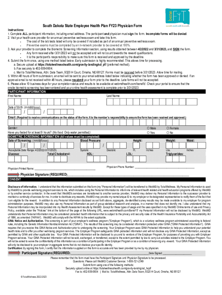 South Dakota State Employee Health Plan FY23 Physician FormInstructions: 1. Complete ALL participant information, including email address. The participant and physician must sign the form. Incomplete