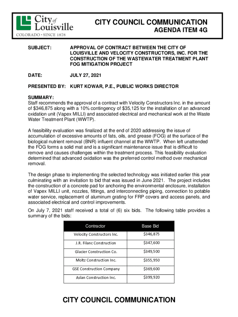 CITY COUNCIL COMMUNICATION AGENDA ITEM 4G SUBJECT:APPROVAL OF CONTRACT BETWEEN THE CITY OF LOUISVILLE AND VELOCITY CONSTRUCTORS, INC. FOR THE CONSTRUCTION OF THE WASTEWATER TREATMENT PLANT FOG MITIGATION