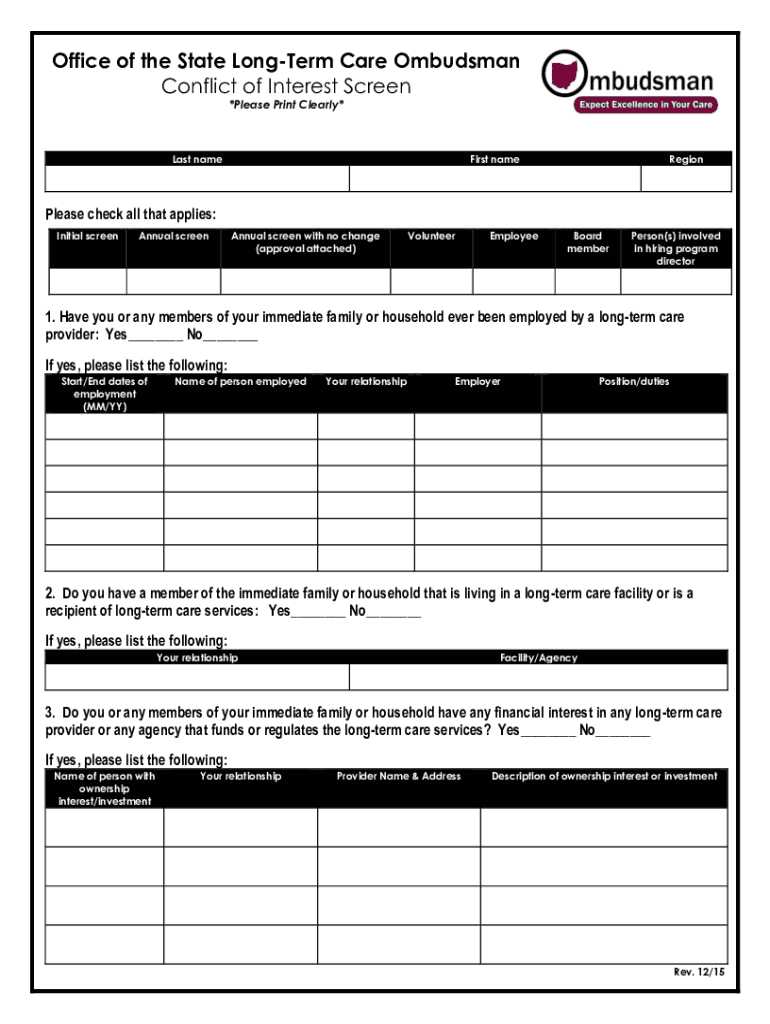 Office of the State Longer Care Ombudsman Conflict of Interest Screen *Please Print Clearly×Last nameFirst nameRegionPlease check all that applies: Initial screenAnnual screen with no change (approval
