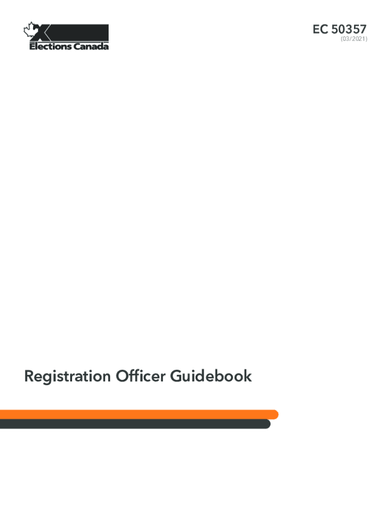 EC 50357 (03/2021)Registration Officer GuidebookROCPSDRORegOIOReturning OfcerCentral Poll SupervisorDeputy Returning OfcerRegistration OfcerInformation OfcerImportant information Electoral District