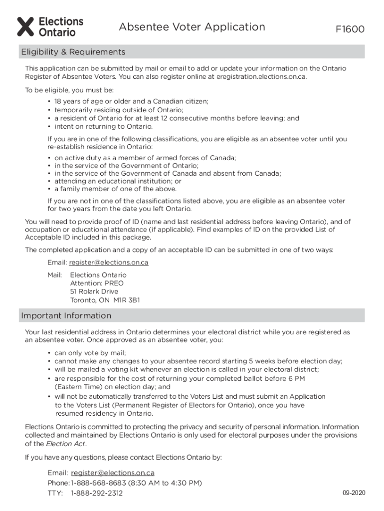 Absentee Voter ApplicationF1600Eligibility & Requirements This application can be submitted by mail or email to add or update your information on the Ontario Register of Absentee Voters. You can also