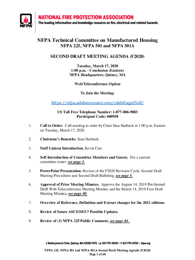 NFPA Technical Committee on Manufactured Housing NFPA 225, NFPA 501 and NFPA 501A SECOND DRAFT MEETING AGENDA (F2020) Tuesday, March 17, 2020 1:00 p.m. Conclusion (Eastern) NFPA Headquarters, Quincy,