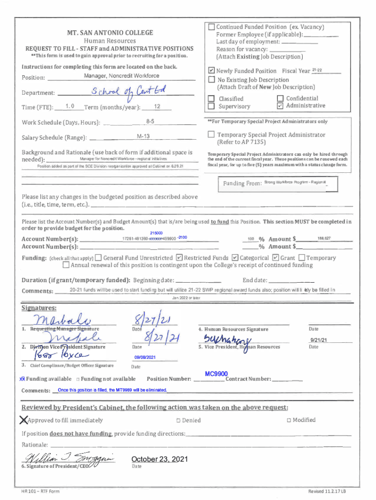 0 Continued Funded Position(ex. Vacancy) (Former Employee if applicable): ___ Last day of employment: ___ Reason for vacancy: ___ (Attach Existing job Description)MT. SAN ANTONIO COLLEGE Human ResourcesREQUEST