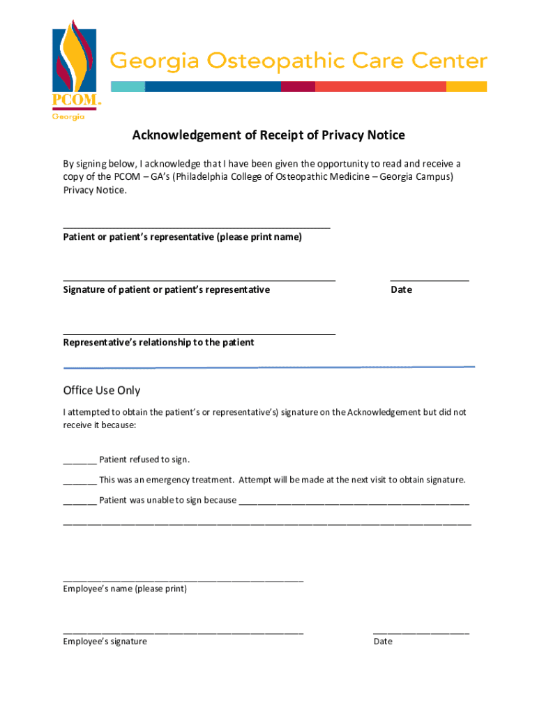 Acknowledgement of Receipt of Privacy Notice By signing below, I acknowledge that I have been given the opportunity to read and receive a copy of the COM GA's (Philadelphia College of Osteopathic